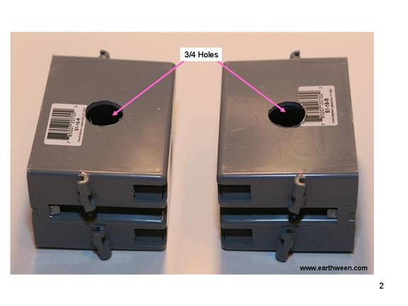 Step 1 Drilling Holes in the Outlet Boxes If your outlet boxes have predrilled holes, you can skip this step. Drill a 3/4 hole in the center of each outlet box. Make sure the holes are dead center (see Figure 2). Also make sure the holes are drilled on the sides of the outlet boxes that are flat/flush. The other side of the outlet has tabs which will impede the ability to screw the two outlet boxes together with the NM connector.