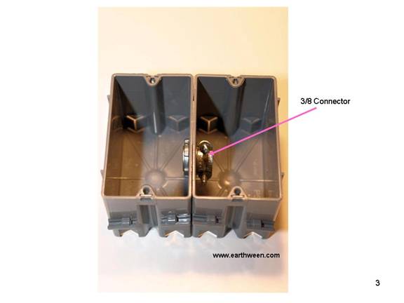 Step 2 Connecting the Outlet Boxes Figure 3 depicts the two outlet boxes connected by a 3/8 NM connector. If your outlet boxes are already joined together, you can skip this step. Otherwise, unscrew the connector parts and insert the male (threaded) end of the connector through one of the holes of one of the outlet boxes from the inside. If needed, screw the connector until the threads show outside the outlet box. Then attach (screw) the other outlet box onto the threads of the exposed connector until at least one thread of the connect sticks through the inside of the second outlet box. You then should be able to screw the female (“nut”) of the connector onto the thread(s) inside the second box.