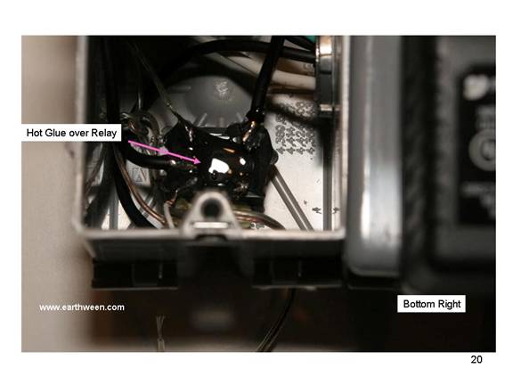 Secure the relay to the bottom of the left outlet box as seen in Figure 19. Just place a dap of hot glue on the bottom of the relay and secure to the bottom of the left outlet box.