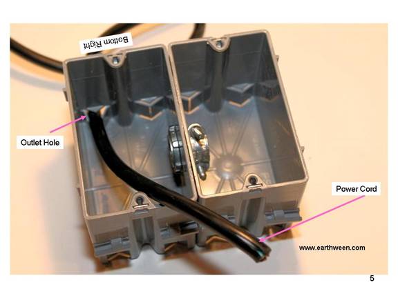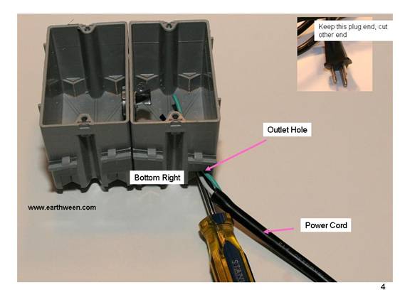 Step 3 Connecting the Power Cord You will need to cut the end off of the power cord, the female end (NOT the end that plugs into the wall). Cut the end off as close to the female plug as possible. This will give your control more power cord length. There are slotted holes in the outlet boxes. Use a screw driver and push through the slotted hole and then push through the power cord. You can choose to strip off some of the outside insulation of the power cord, exposing the 3 inner wires before or after the insertion of the power cord through the slotted hole. Figure 4 shows a screw driver assisting the power cord through the slotted hole of the right outlet box.