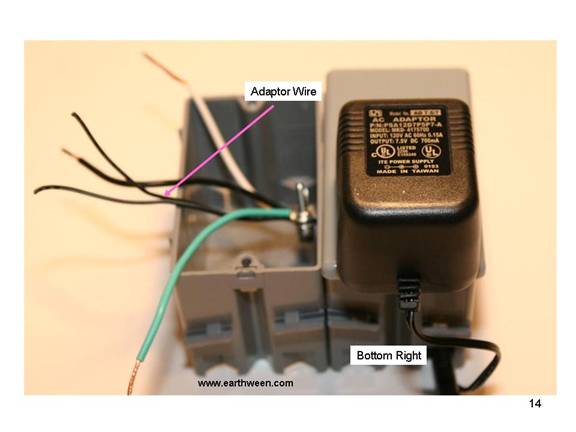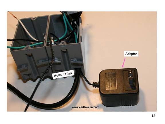 Step 6 Installing the Power Adaptor The power adaptor should take an input voltage of 110-125VAC and output 6-9VDC around a 500ma. The low voltage DC power will be used to trigger a relay that will complete the AC circuit to pass AC power from the input outlet (right) to the output outlet (left). Cut the power adaptor wire, leaving about 12 inches of wire. Thread the wire through the outlet box slotted hole, same one the power cord is running though. Use the small zip tie to secure the adaptor wire to the power cord inside the outlet box. Leave enough of the adaptor wire (enough slack) to allow the adaptor to plug into the top of the right outlet once mounted. Three inches should do. See Figure 14.