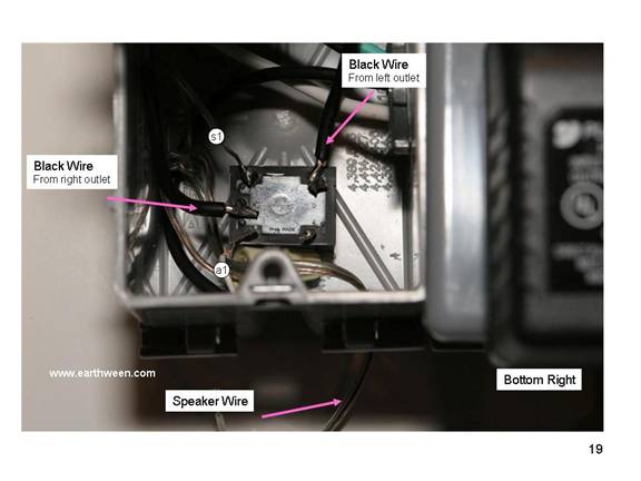 Once the wire is inside the left outlet box, split the wire into its two halves and tie a knot in the speaker wire to prevent it from getting pulled back through the slotted hole…similar concept to the zip tie method securing the power cord/adaptor wire in previous steps. Just make sure the wire can be pulled back through the outlet box. Strip the ends of the speaker wire inside the left outlet box and the ends of the adaptor wire also in the left outlet box. Twist one of the adaptor wires and one of the speaker wires together in a clockwise fashion and secure with the electrical nut, again twisting in a clockwise direction. In Figure 17, a2 and s2 represent an adaptor wire and the speaker wire respectively joined. Wires a1 and s2 are left “unmarried” at this time. They will be soldered to the relay later.