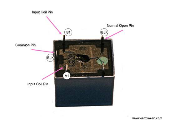 The following diagram depicts another view of the relay. The relay pictured is actually a different “brand/vendor” of SPDT relay, but functions exactly the same. Notice that we only use 4 of the 5 pins/prongs.