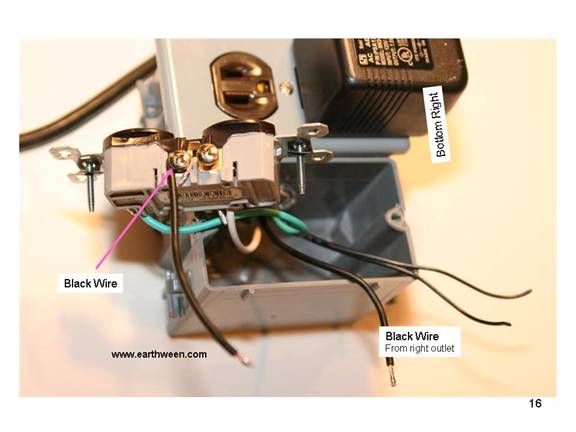 Turning over the outlet, connect a 4 inch (short) black wire to the black (hot) side terminal. You should strip the black wire on one end to expose 1 inch of copper and on the other end expose ¼ inch of copper wire. Twist and solder both ends if desired. Connect the 1 inch side of the wire to the “hot” side of the outlet as seen in Figure 16. DO NOT connect the black wire from the right side outlet at this time… it will get connected to the relay later.