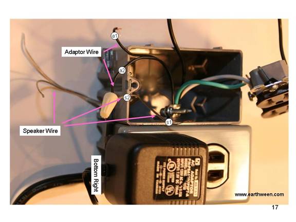 Step 8 Installing the Speaker Wire For the lack of a better description, we need to install some speaker wire that will eventually connect to the wire running to the switch mat. Any wire could have been used, but speaker wire is the right size for the job. The speaker wire will help complete the circuit for the direct current (6VDC) loop from the adaptor through the switch mat to the relay that will complete the AC circuit from the right outlet power to the left outlet. Insert the 8 inch speaker wire into the left outlet slotted hole as seen in Figure 17. I would choose the right slot on the left outlet box.