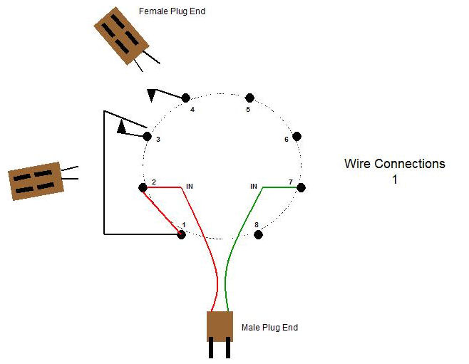 Step 2 Pin 1 is going to be one side of the circuit that we need to get power to in order to power the ends of the extension cords. We need to provide power to pin 1 since it is involved in our “complete” circuit round trip (when involved with either pin 3 or pin 4). Bind pins 1 and 2 together. Strip off some bare wire from the excess wire from the extension cords you cut or will cut in Step 3 or use some other excess wire. Wrap pins 1 and 2 together and use some solder to secure the wires to the pins so that they won’t ever get dislodged. See Figure 5.