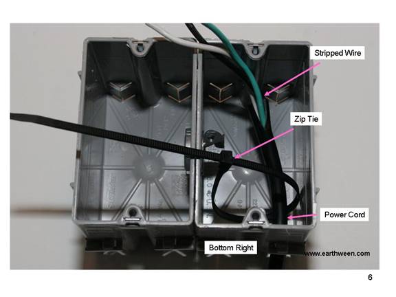 Make sure there are about 3 inches of the stripped (3 wires exposed) and 2 inches of the unstripped wire through the outlet box for a total of about 5 inches. Use the zip tie (Figure 6) and secure it around the black (unstripped) portion of the power cord and secure it tightly around the base of the cord where it enters the outlet box…inside of the box.