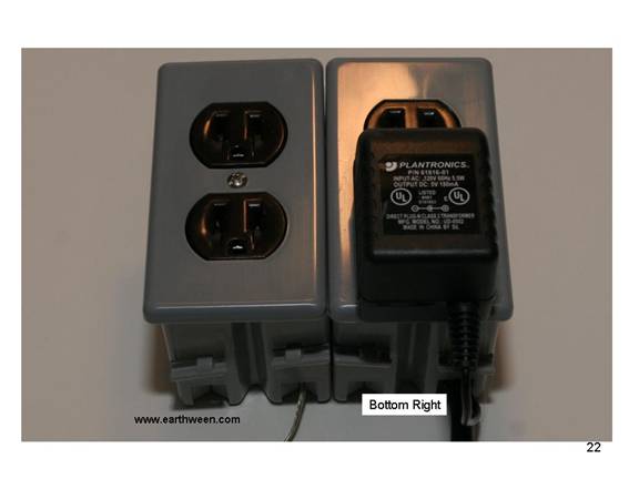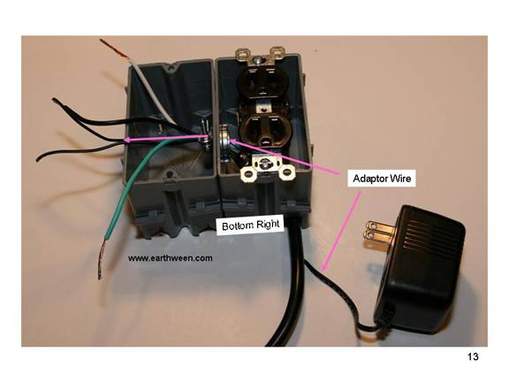 Step 6 Installing the Power Adaptor The power adaptor should take an input voltage of 110-125VAC and output 6-9VDC around a 500ma. The low voltage DC power will be used to trigger a relay that will complete the AC circuit to pass AC power from the input outlet (right) to the output outlet (left). Cut the power adaptor wire, leaving about 12 inches of wire. Thread the wire through the outlet box slotted hole, same one the power cord is running though. Use the small zip tie to secure the adaptor wire to the power cord inside the outlet box. Leave enough of the adaptor wire (enough slack) to allow the adaptor to plug into the top of the right outlet once mounted. Three inches should do. See Figure 14.