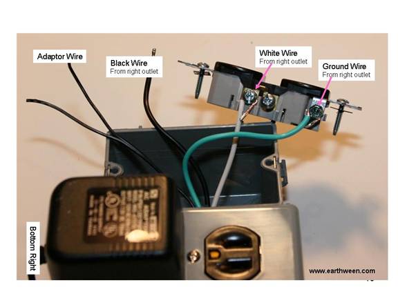 Construction Overview The construction of the control isn’t that complicated. We basically need to transfer AC power from our control to our prop when the mat is stepped on. We first need input power. One of the outlets (right) of our control will be supplied input power from the power cord. We will power our adaptor (wall wart) with this same input power. The other outlet (left) on our control will be our “output” power source. Output will be 120VAC, same as our input. We will get our output power from the input source, but only through the completed circuit made by our relay. We basically use the common and ground wires from our input outlet and connect them to the output outlet. We connect the hot (black) input power wire to the output terminal of the relay and the other terminal we connect to the output outlet. We connect the one wire (negative or positive) of the low voltage output of the adaptor to one of the inputs of the relay. We connect the other adaptor wire to one of the wires of the switch mat. The other wire of the switch mat is connected to the other input of the relay.
