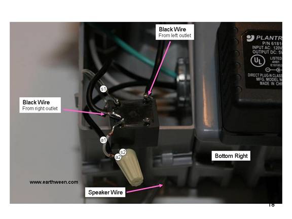 Once the wire is inside the left outlet box, split the wire into its two halves and tie a knot in the speaker wire to prevent it from getting pulled back through the slotted hole…similar concept to the zip tie method securing the power cord/adaptor wire in previous steps. Just make sure the wire can be pulled back through the outlet box. Strip the ends of the speaker wire inside the left outlet box and the ends of the adaptor wire also in the left outlet box. Twist one of the adaptor wires and one of the speaker wires together in a clockwise fashion and secure with the electrical nut, again twisting in a clockwise direction. In Figure 17, a2 and s2 represent an adaptor wire and the speaker wire respectively joined. Wires a1 and s2 are left “unmarried” at this time. They will be soldered to the relay later.