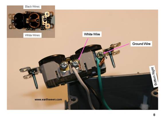 Step 4 Connecting the Right Side Outlet The right outlet receives power from our power cord. We need to connect the three wires from the power cord to the outlet. On the bottom side of the outlet, there should be a notation that says “white wires”. The white wire is typically the common wire. The black wire is the “hot/live” wire and the green (or off color) is the ground. Make sure the white wire is connected to the correct side of the outlet and the ground wire is connected to the ground terminal (screw). The white wire screw is typically silver and the black wire screw is typically a brass color. You will need to strip about 1 inch of the insulation of each of the wires from the power cord using a wire stripper. Note: you will see some solder on the tips of the three wires in the pictures shown. Using some solder on the tips of the wires helps keep them together so that no stray copper strands become loose or exposed. When outside insulation of each wire is stripped and the copper wire is exposed, twist the copper wires in a clockwise fashion into a tight wind. Then, if desired, apply some solder to the tips of the copper wire to keep the strands together. When attaching each wire to the proper screw on the outlet, you will need to first loosen the screw in a counter clockwise turn. I suggest wrapping the wires around each screw of the outlet in a clockwise fashion. This helps keep the wire wrapped around the screw when the screw is tightened. Tighten each screw (terminal).