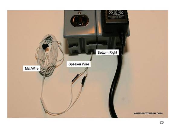 Step 8 Installing the Speaker Wire For the lack of a better description, we need to install some speaker wire that will eventually connect to the wire running to the switch mat. Any wire could have been used, but speaker wire is the right size for the job. The speaker wire will help complete the circuit for the direct current (6VDC) loop from the adaptor through the switch mat to the relay that will complete the AC circuit from the right outlet power to the left outlet. Insert the 8 inch speaker wire into the left outlet slotted hole as seen in Figure 17. I would choose the right slot on the left outlet box.