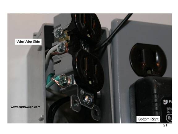 Figure 21 shows the left outlet being installed in the left outlet box, properly (ground holes down) with the white/ground wires on the left side.