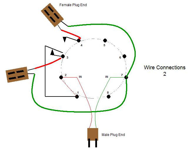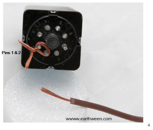Step 2 Pin 1 is going to be one side of the circuit that we need to get power to in order to power the ends of the extension cords. We need to provide power to pin 1 since it is involved in our “complete” circuit round trip (when involved with either pin 3 or pin 4). Bind pins 1 and 2 together. Strip off some bare wire from the excess wire from the extension cords you cut or will cut in Step 3 or use some other excess wire. Wrap pins 1 and 2 together and use some solder to secure the wires to the pins so that they won’t ever get dislodged. See Figure 5.
