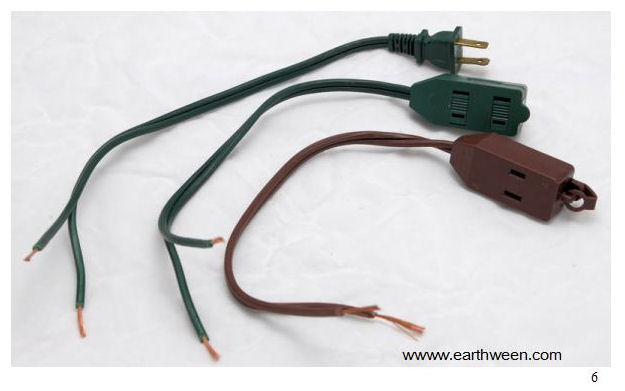 Step 3 Cut your extensions cords to the desired length. In the photos, I used a shorten length to demonstrate the technique. You really don’t need a lot of length since the control usually sits in-between a prop and another trigger control. I would work with a smaller length for the first control you attempt to build. You will need the male end of one extension cord and both female ends of both cords. Cut the cords at about the 12” inch length and split. Each wire end should now have two wires. Strip all ends with a wire stripper. Figure 6 shows the extensions cords cut, stripped, and ready to go.