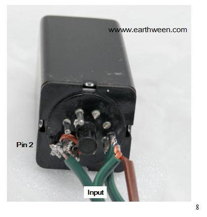 Step 1 I like to cut (remove) the three pins that aren’t used in the control. I use wire cutters to snip pins 5, 6 and 8. Figure 4 depicts the relay with the cut poles (hard to see). In the diagram below, we see where input power is applied. Based on the schematic of the relay, we know it takes 120 VAC power and the relay is triggered by applying this power to pins 2 and 7.