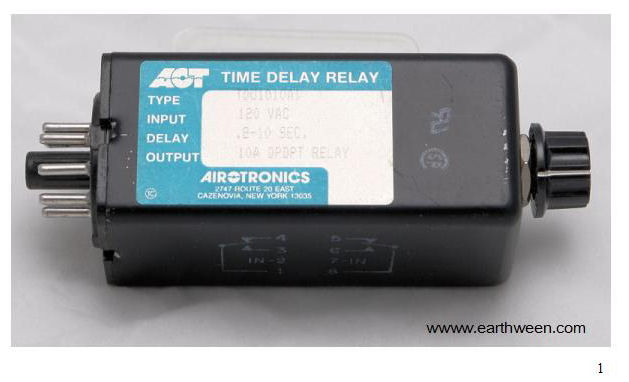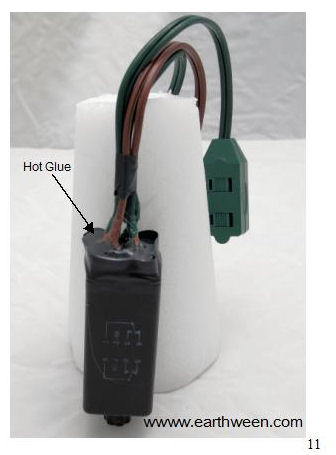 Repeat the solder connection for the last remaining loose wire end (from the other female). Solder the wire to pin 4 of the control, again, in a vertical position, securely and free from contact with other pins. Figure 9 shows the three connections soldered to the appropriate relay pins. Step 6 - Testing It is a good idea to test your control before continuing. However, testing the control in this state is dangerous. Make sure none of the control pins (with solder connections) is touching another (with the exception of pins 1 & 2). Beware; this step is only for people with electrical and electronic project skills and the knowledge of the involved hazards to property and to life forms including people, and the necessary safety procedures. Use the information here at your own risk. Be prepared In a bad case scenario, your power strip circuit breaker will trip or even worst, your household circuit breaker (or fuse) will trip (or blow in the case of a fuse). Don’t panic; just be prepared to reset the circuit breaker (or replace a fuse). Know where your circuit breaker box is and make sure you have a flash light in the case you loose light in the room where the circuit breaker box is located. Now on to the test Plug in a small lamp into one of the female ends of the control. I suggest plugging into the female cord connected to pin 4. We know when the control powers up, this female end should have power initially. Make sure the lamp switch is in the ON position for this test. Set the timer dial (if your relay has adjustable time delay) to something short, say 5 seconds. Then plug in the control (male end) into a live power source. I suggest using a power strip with some sort of circuit protection (breaker). I would turn the power strip off and plug in the control. Then, when ready, flip the switch of the power strip. If things are working, the lamp should light up. After 5 seconds, the lamp should shut off and remain off. To test the other behavior, turn off the power strip and change the lamp from being plugged into the female end connected to pin 3. In this configuration, when the control receives power, the lamp should NOT turn on until the elapsed time expires. Perform the test by flipping the switch on the power strip and take notice, after 5 seconds, the lamp turns on and stays on. Other problems Not all relays are made to operate in the same manner. Some relays have different input (coil) requirements. Some are 24 DC, some are 24 AC, this document and information assumes you are working with a 120 AC coil. The nice thing about working with this type of relay is that we can use the input power that triggers the relay to power our output devices using 120 AC power. Step 7 - Final Assembly After successful testing has been accomplished, you should do something to cover and protect your wire and connections. I like to use a hot glue gun and melt the glue into and around the connections. I use black tape and form a repository “lip” around the base of the relay….creating an area for the hot glue to fill around the base of the wires and connections